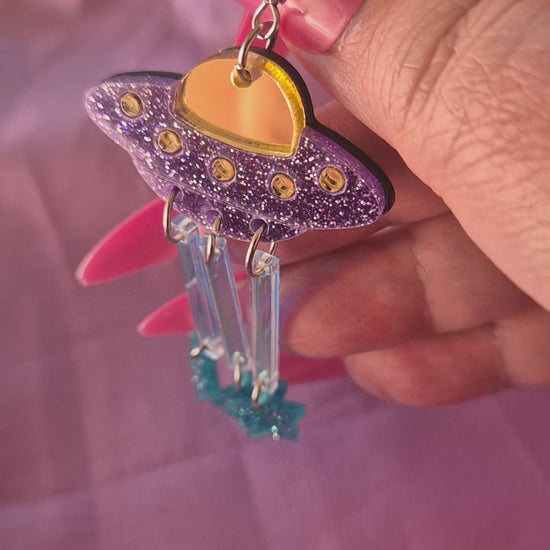 The Casual Cosmic Earrings are here to take you from “just hanging out” to full intergalactic slay. Featuring glittery purple UFOs, mirrored beams, and dangling stars, these earrings are bold, sparkly, and totally out of this world.