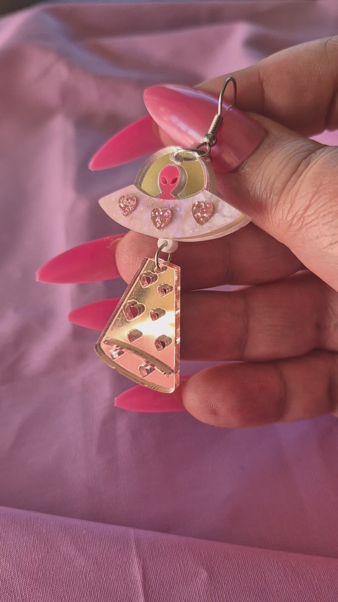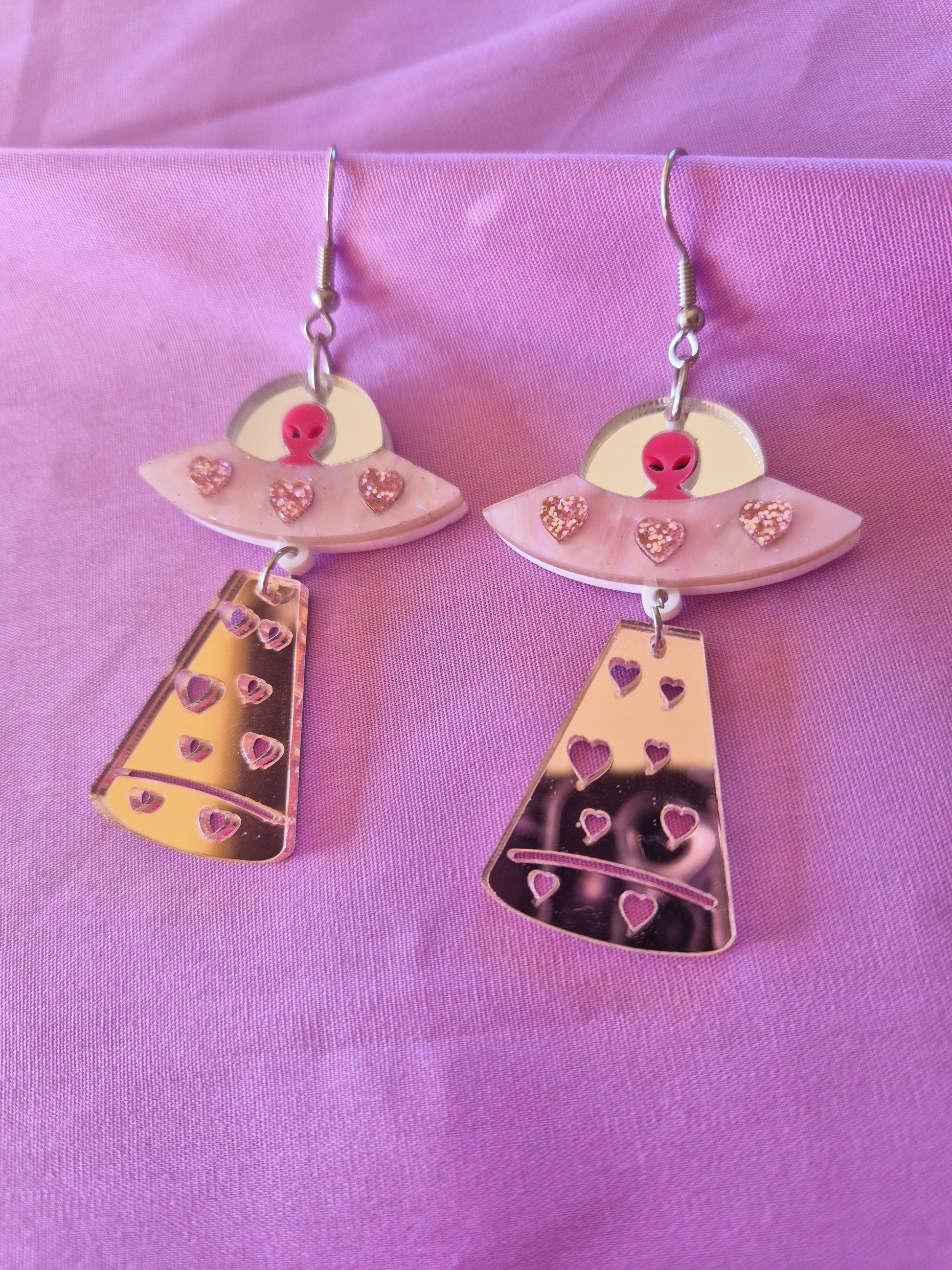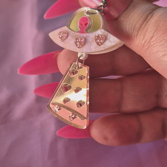 Say hello to your new favourite statement piece: the Galactic Girl Earrings. Inspired by this unforgettable Chappell Roan look, these acrylic UFO earrings are beaming with mirror-like shine, glittery pink hearts, and a cute-as-hell alien pilot.