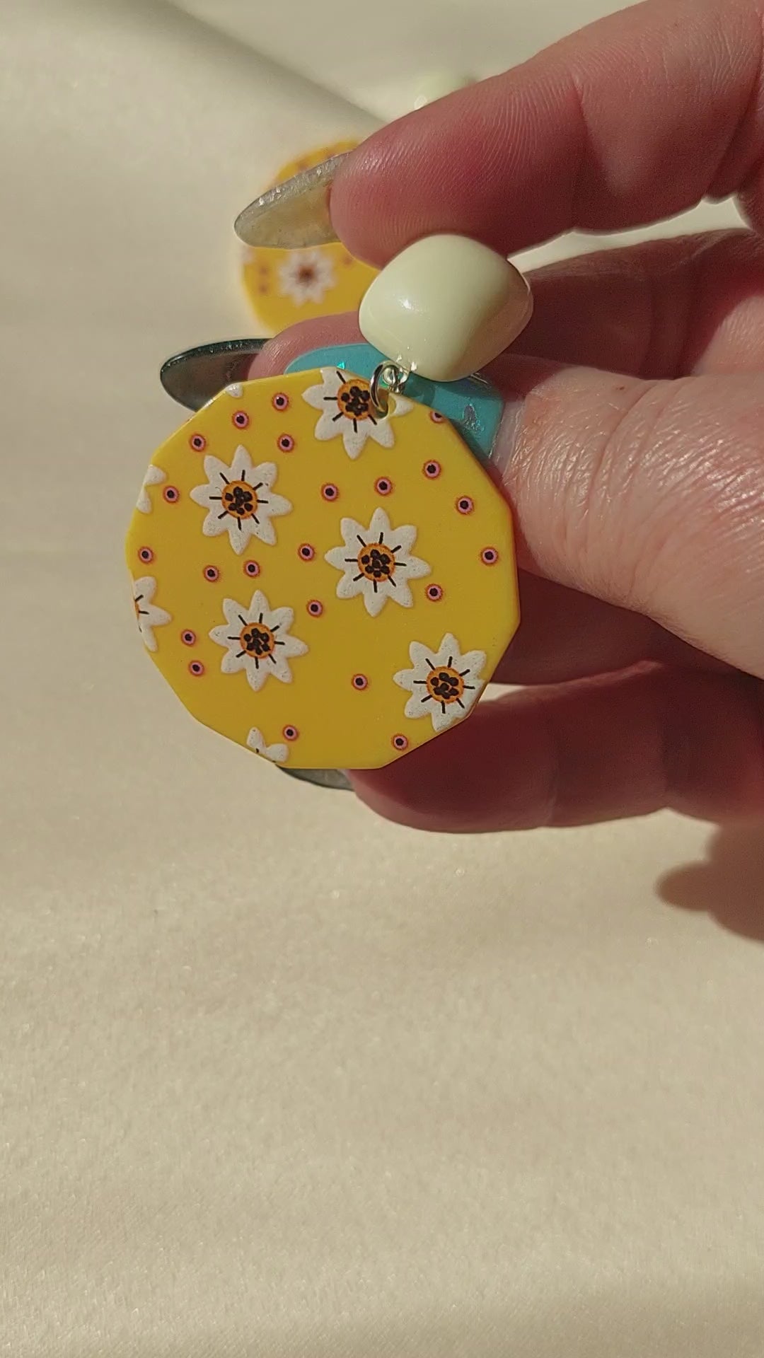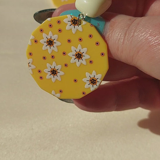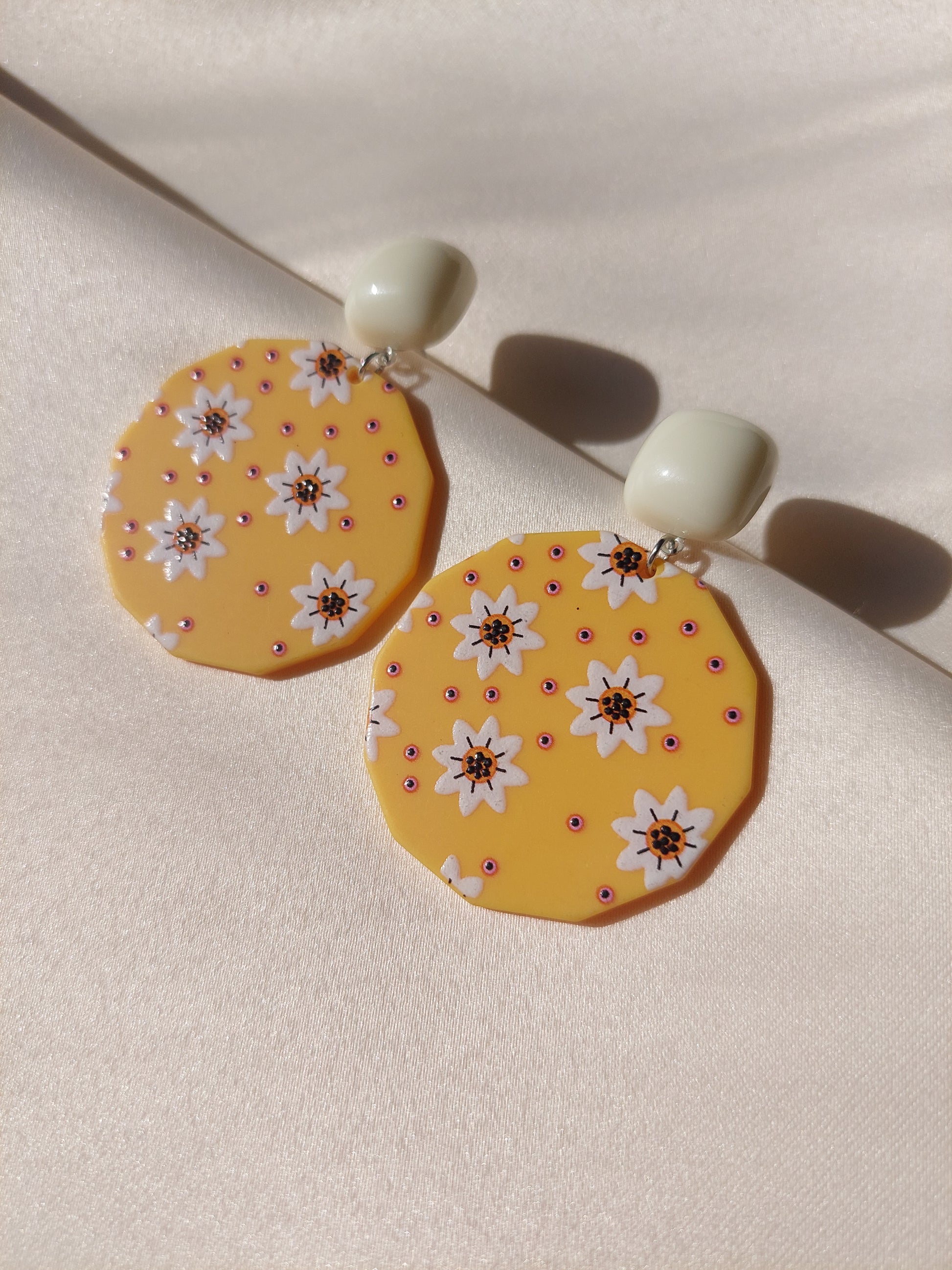 These earrings are the epitome of summer vibes, with a design inspired by the blooming flowers of the season. The golden honey hue of the flowers and the delicate petals are sure to add a touch of sweetness to any outfit. These earrings are not quite circular - they're dodecagons with 12 sides.