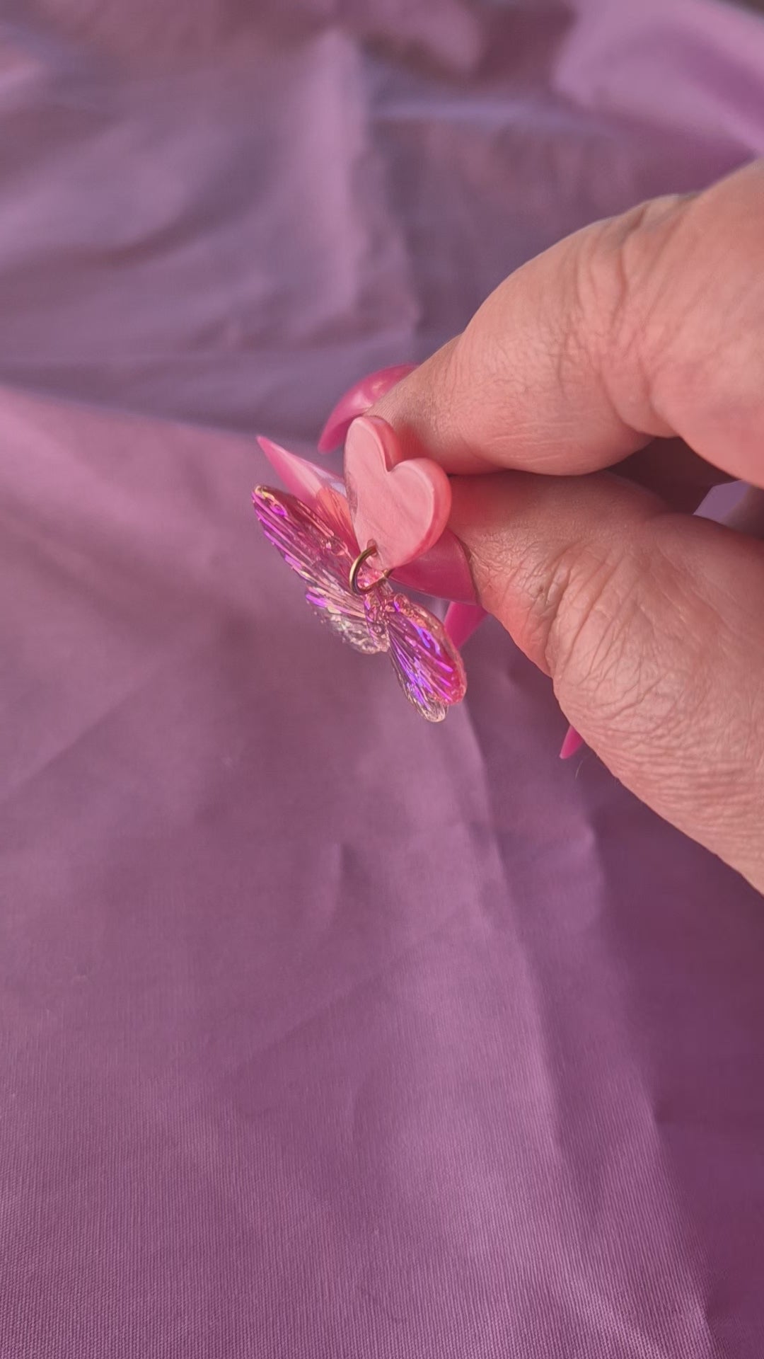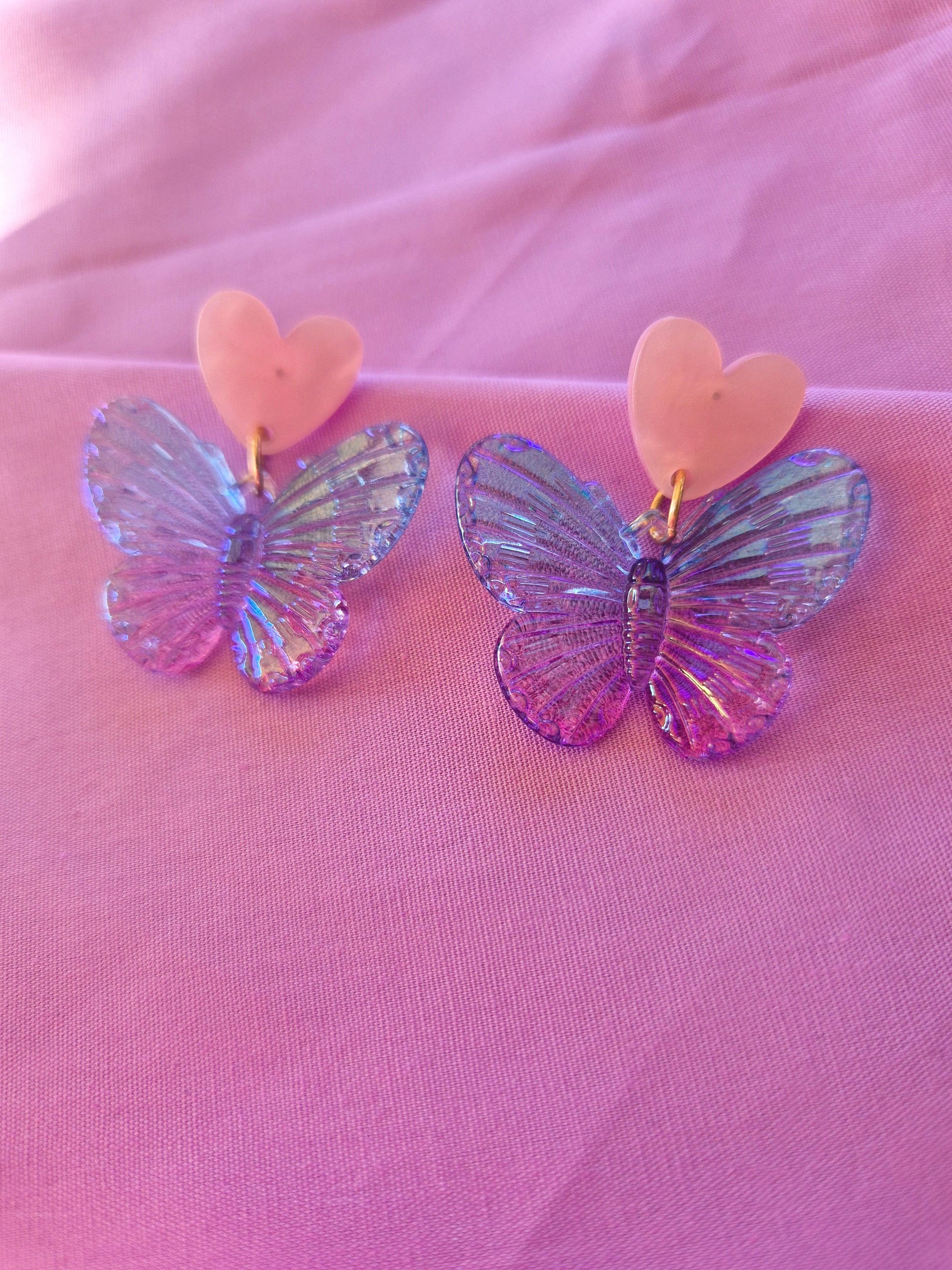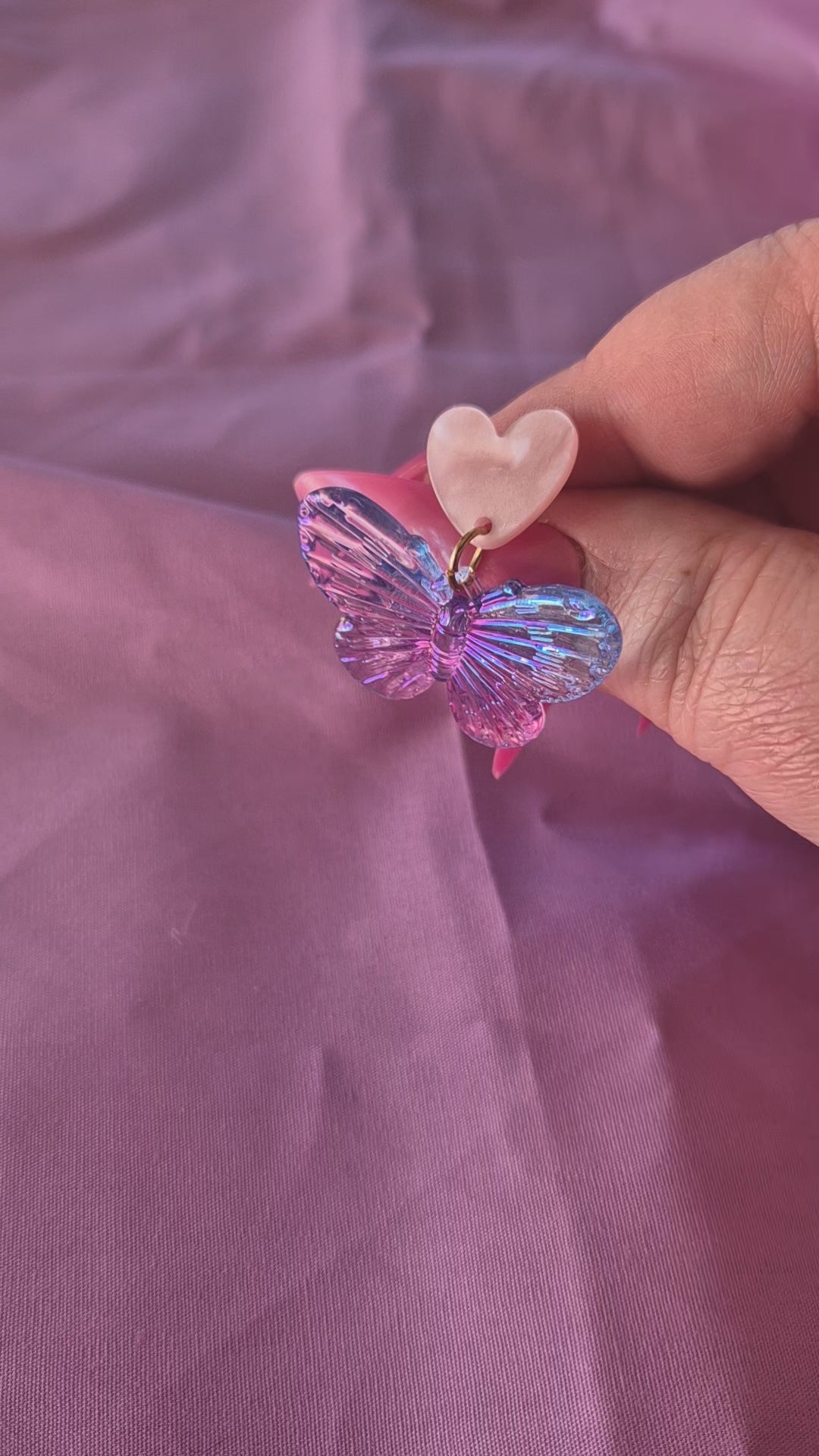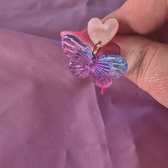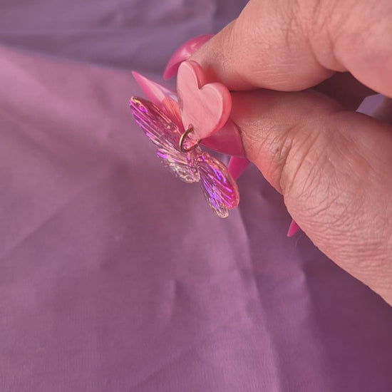 The Kaleidoscope Butterfly Earrings are here to bring full ethereal glam to your lobes. Featuring iridescent purple butterflies that shift in the light and dangle from pastel pink hearts, these earrings are giving dreamy, glittery, soft-pop fantasy.