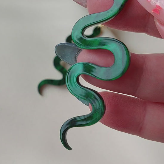 Their sleek and elegant! The green design evokes a sense of mystery and power, reminiscent of the noble house of Slytherin from the world-renowned Harry Potter series. Whether you are a fan of the books or simply appreciate the artistry of these earrings, they are sure to add a touch of magic to any outfit. Order your pair today and embrace your inner Slytherin!