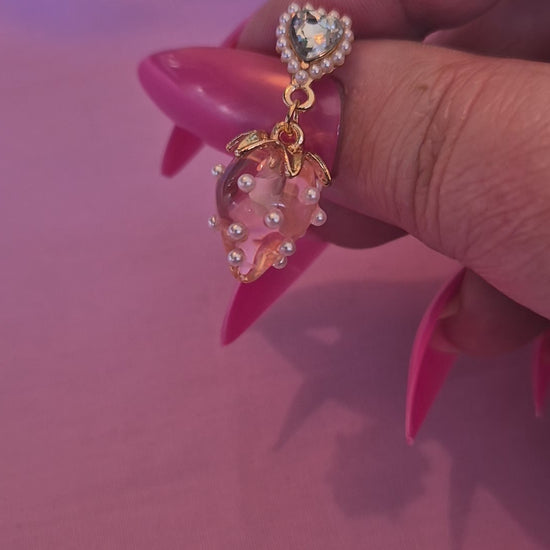 Add a little love to your lobes with our Sweetheart Strawberry Earrings! These delicate pink strawberries are studded with tiny pearls and topped with gold-tone details, all hanging from a heart-shaped stud that brings the romance. Lightweight and full of charm, theyโre perfect for dreamy days, date nights, or just feeling cute as heck.