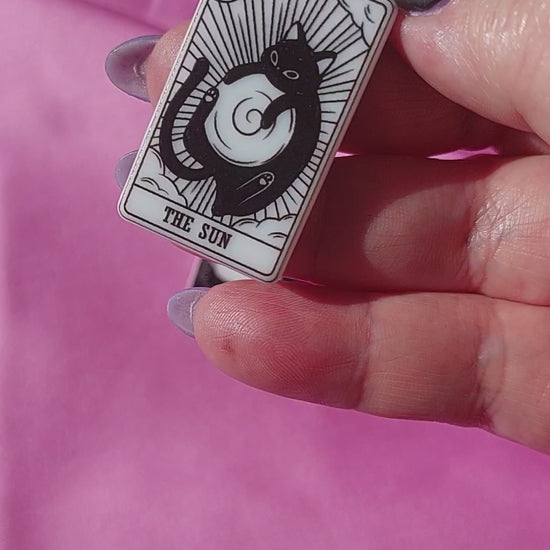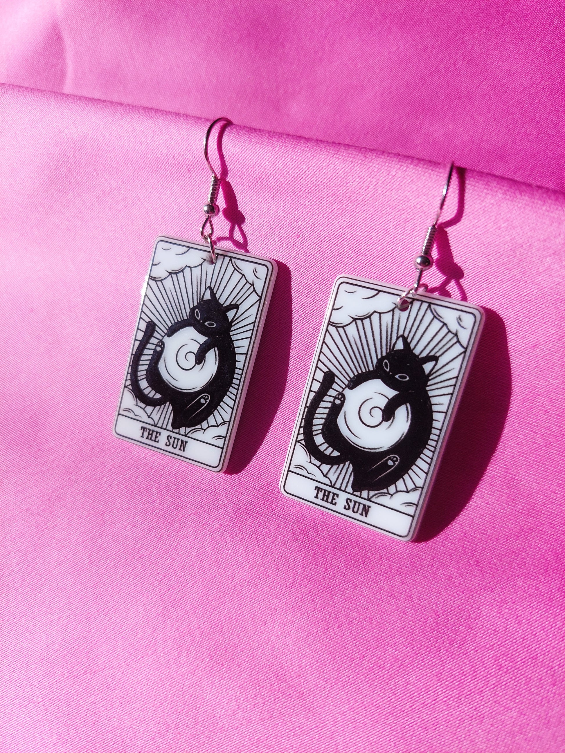 Radiate positivity with Lunar Belle Gems’ The Sun Tarot Cat Earrings, perfect for those who embrace joy and vitality. These vibrant black and white earrings feature The Sun tarot card on the front, symbolising success and optimism, while the back showcases a charming tarot cat design that will have you feline fabulous.