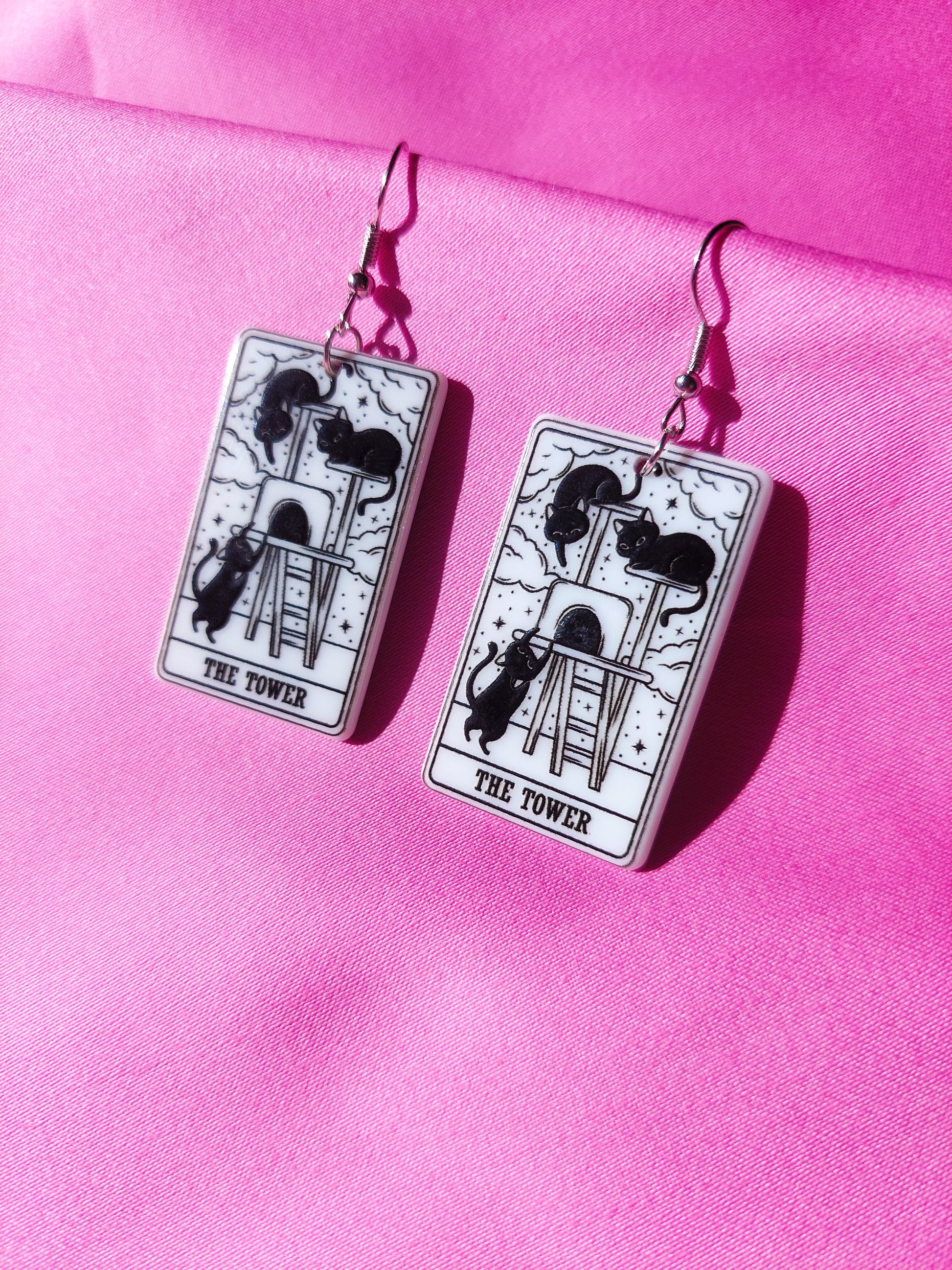 Experience a powerful transformation with Lunar Belle Gems’ The Tower Tarot Cat Earrings, crafted for those who embrace change and revelation. These striking black and white earrings feature The Tower tarot card on the front, symbolising upheaval and new perspectives, while the back showcases a playful tarot cat design that will have you climbing to new heights.